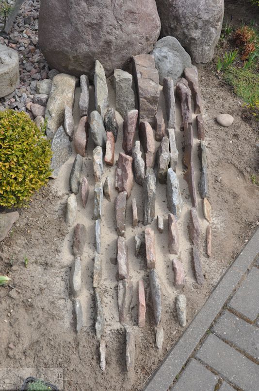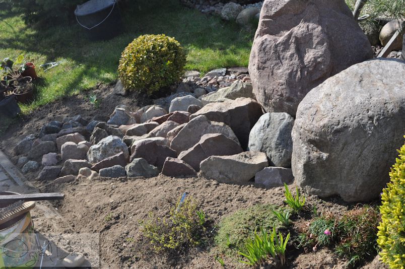 Przyznam, że nie do końca mogłam spełnić wszystkie założenia i np. nie dobierałam specjalnie tworzywa jakim jest kamień. Muszę jednak uprzedzić, że skład skał użytych do budowy skalniaków nie jest bez znaczenia. Skały oddziaływają na rośliny przez wypłukiwanie z nich składników mineralnych, a te zakwaszają lub zobojętniają glebę. Nie wszystkie rośliny pasują do wszystkich skał. I nie chodzi tutaj tylko o wygląd i kompozycję, ale działanie biochemiczne. Ograniczałam się do zebrania odłamków skalnych rodzimych, znalezionych na spacerze, na budowie - gdzie ciężkie maszyny rozkruszały większe głazy - w mojej okolicy są to przeważnie narzutowe, otoczaki, granity.