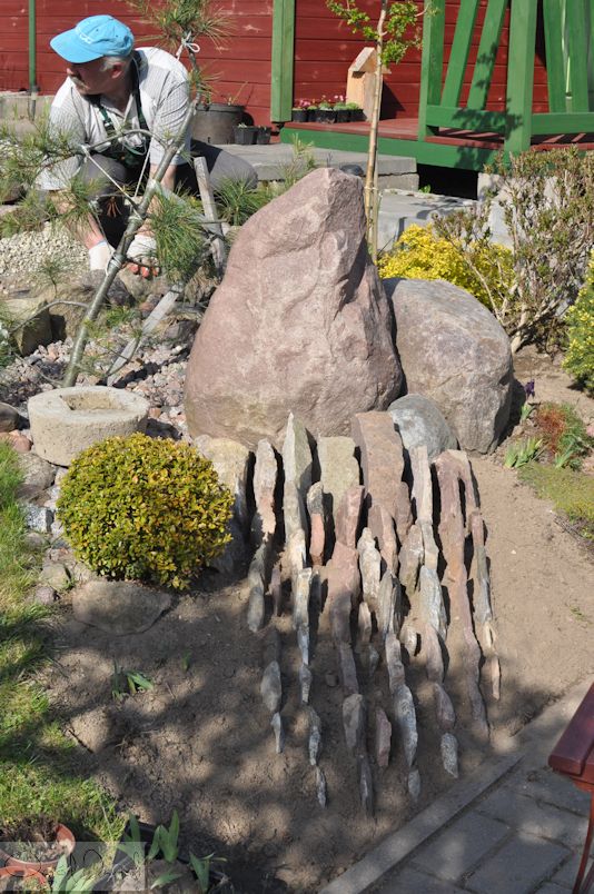 2. W kolejnym etapie układałam większe odłamki skalne, poczynając od góry do mniejszych na dole przy chodniku. Kierunek przebiegu skał południowo-zachodni do północno-wschodniego. Wybrałam taki, by odłamki skalne największą swą powierzchnią dawały niewielki cień drobnym roślinom skalnym, a jednocześnie niczym akumulatory ładowały się południowym ciepłem, by potem oddać je "w nogach" roślin. Kamienie wciskałam w rozpulchnioną wcześniej glebę na jakąś 1/3 głębokości.