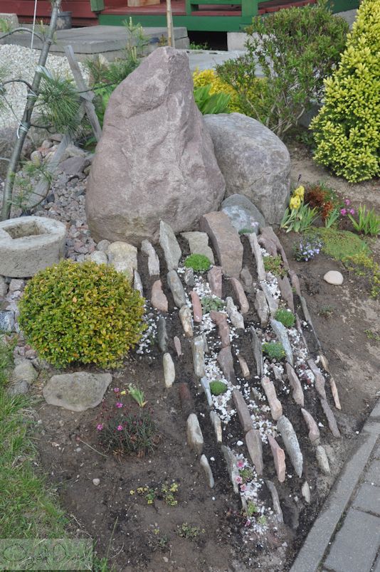 Pomimo strat i drobnych porażek, jestem z tego skalniaka bardzo zadowolona. W mojej ocenie dobrze się prezentuje przy wejściu do ogródka, gdzie każdy z gości pyta co to za skalniaczek "nieznany". Większość zwraca uwagę na szczelinowy układ, więc mój zamysł się sprawdził.