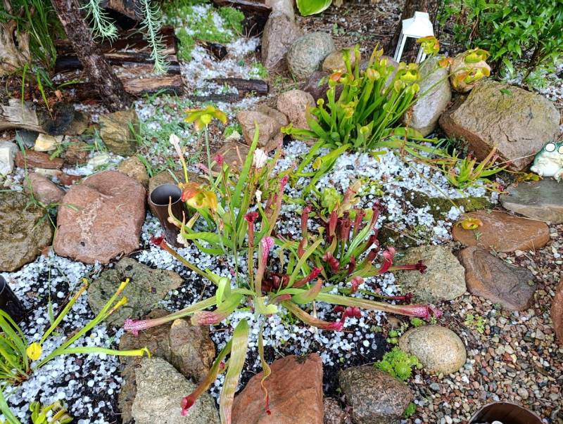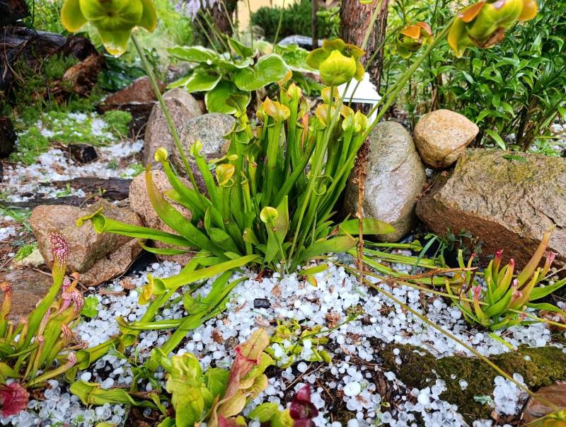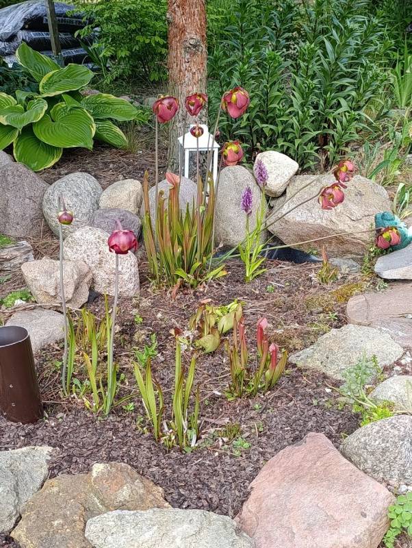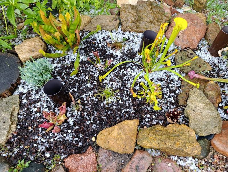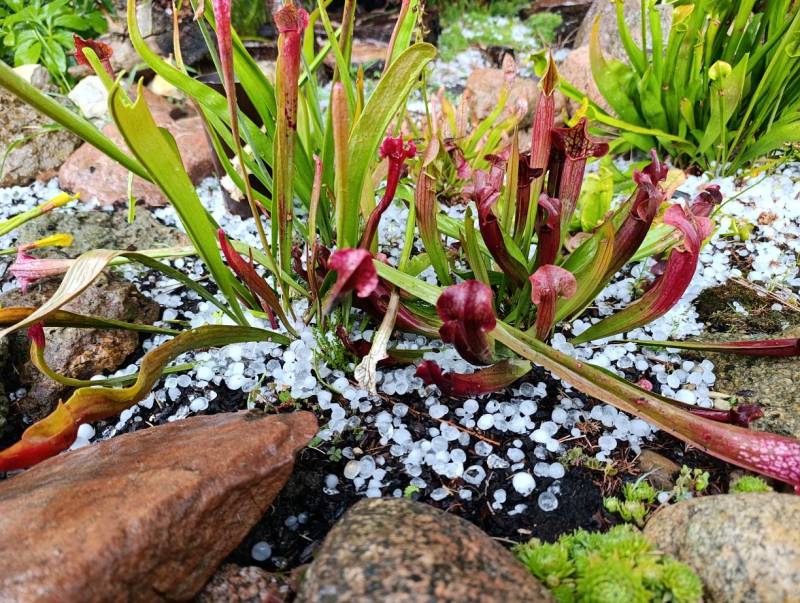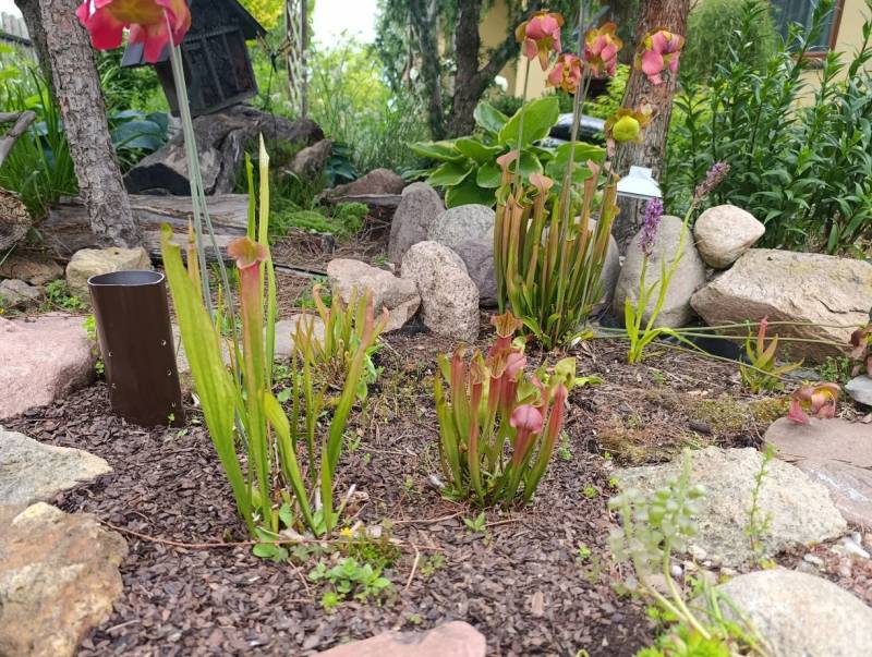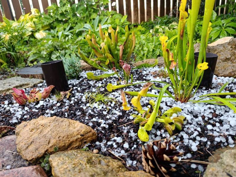 Moje kapturnice w tym roku jakoś słabo rosną, ale ciągle mi mało i w nowym bagienku już troszkę więcej rośnie. Dokupiłam w Biedronce dwie kapturnice, bo tam ich bardzo przesuszają i jakieś dwie rosiczki w LM z wyprzedaży, nie liczę że przeżyją zimę w gruncie bo to raczej z tych ciepłolubnych chyba, ale troszkę porosną no i wsadziłam też modrzewnicę zobaczymy czy będzie lepiej rosła niż normalnie w gruncie. Zdjęcia są jednak z dziś po opadach gradu, na szczęście tych roślin nie uszkodził.