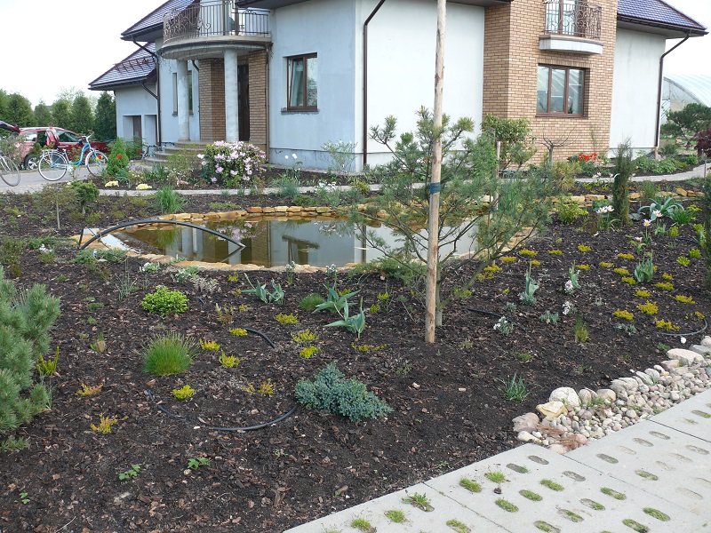 Oczko w nowo powstałym ogrodzie. Według projektu miała być w tym miejscu rabata ciągnąca się wzdłuż ogrodzenia i trawnik, czyli tzw. 'standart'...choć nie do końca bo zamiast szpaleru żywotników postawiono na ciekawe krzewy i iglaki. Po namowie, właściciele działki zdecydowali się na oczko wodne z obrzeżami nawiązującego do wykończenych rabat.