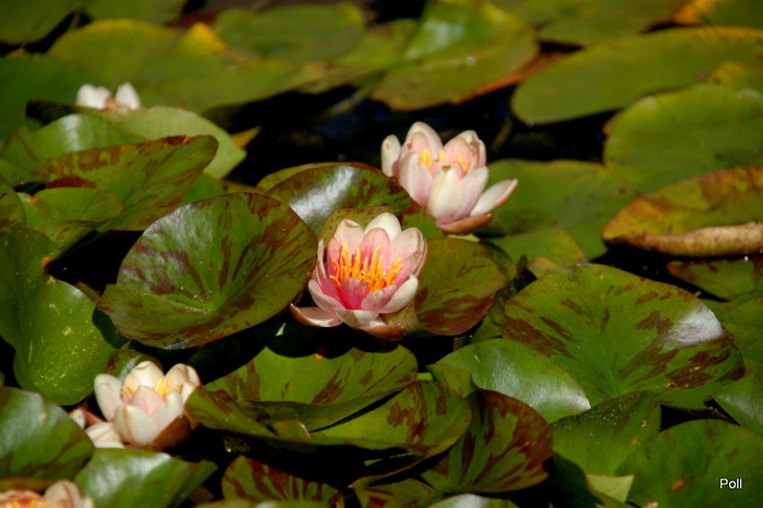 Mam od kilku lat 'Georgia Peach'. Kupiłam ja, jako lilie nadająca sie do nieco płytszych oczek i zatopiłam na głebokości 70-80 cm. Rok starała się rozbujać, ale jak ruszyła, to przyjemnie popatrzeć. Wiosną wypuszcza całe mnóstwo czerwonych liści, które z czasem stają się łąciate- pokryte zielono - brązowym marmurkiem. kwitnie niewielkimi, ale licznymi kwiatami o oranżowym kolorze. Z biegiem czasu oranż blednie, także ostatnie kwiaty są nieco jaśniejsze.