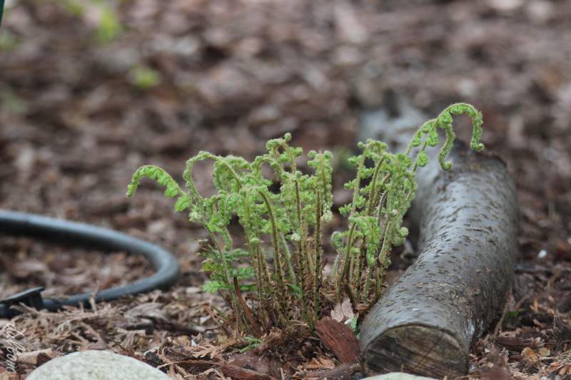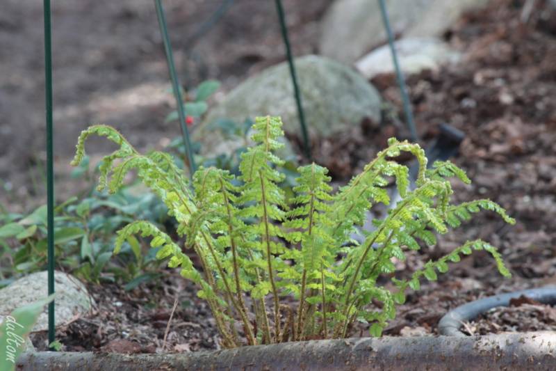 Tu mi jakaś paproć mocno się wysforowała. Mówię jakaś, bo choć kupiłem jako paprotnik lśniący (Polystichum rigens), Tomek Mr. powątpiewa, czy to rzeczywiście ten paprotnik, a nie np. Tsus-simense. Muszę mu się w tym roku poprzeglądać na różnych etapach, bo nie bardzo wiem, gdzie go zamieszczać.