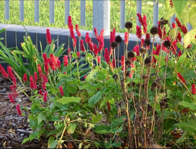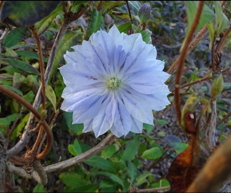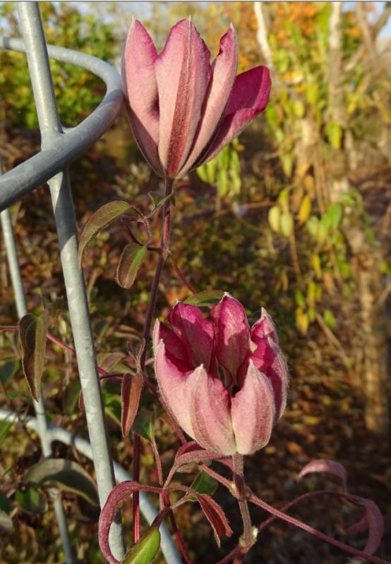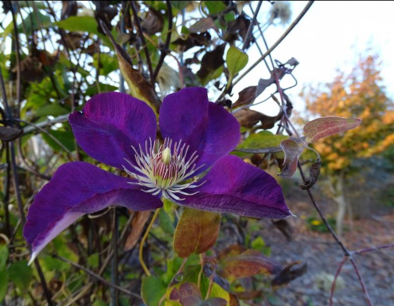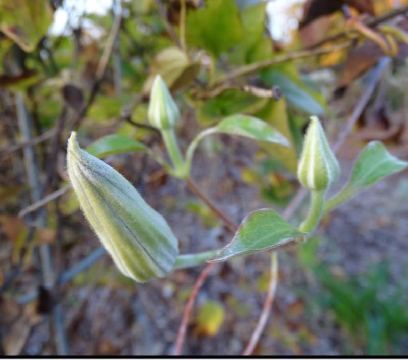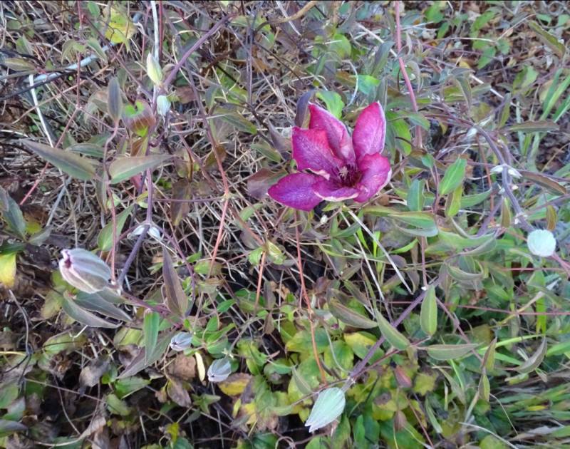 Powojniki też świrują, wśród suchych już badyli nie tylko kwitną, ale wiążą pąki na nowych przyrostach krecigl