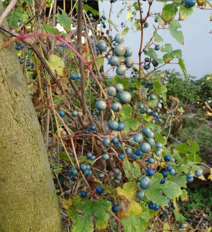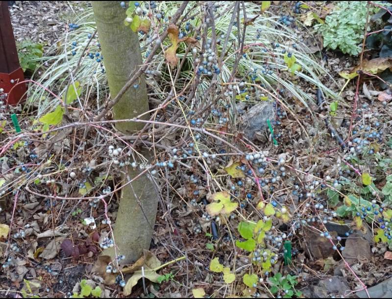 Gosiu tylko tak się wydaje że chwastów nie widać - dzisiaj korzystając z ładnej pogody wypowiedziałam im wojnę :diabelek . Kompostownik został zasilony dwoma 20 l. pojemnikami chwastów. Odkryłam jeszcze jeden zakątek wymagający interwencji :bezsil Trzeba niezwłocznie usunąć winnik zmienny. Nie dość, że zarasta wszystkie drobinki rosnące w pobliżu to jeszcze niesamowicie się sieje. W sumie ma swoje pięć minut wiosną i później jak wybarwią się jagody, jednak szybko tracą kolor i nie są już tak atrakcyjne......wręcz brzydkie :angry:
