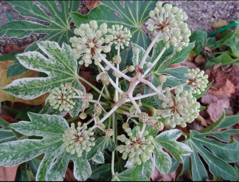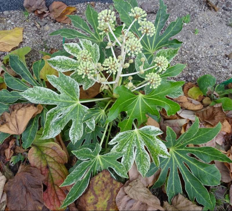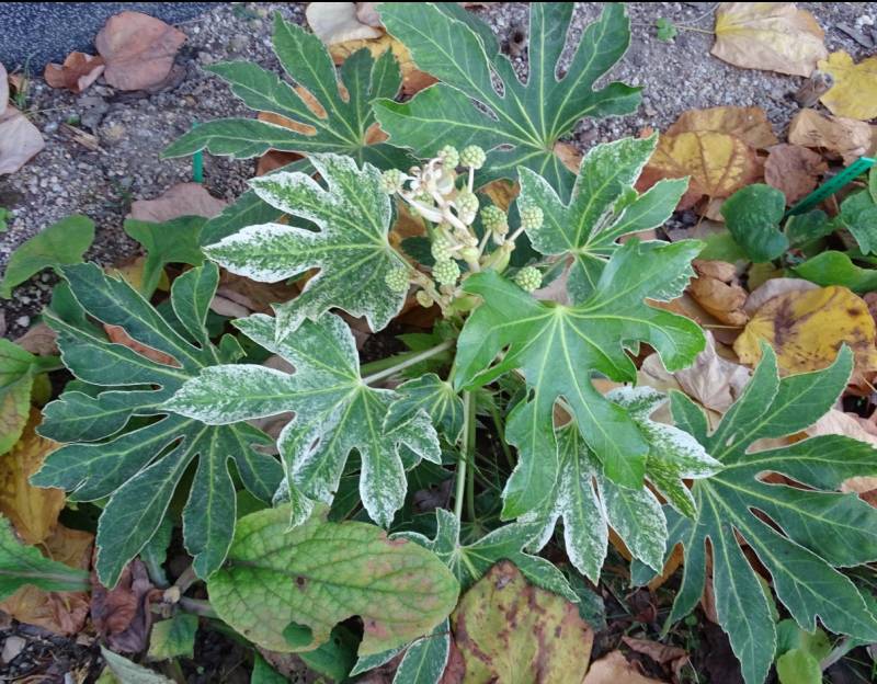 Fatsja japonica 'Variegata' zbiera się do kwitnienia clap clap clap