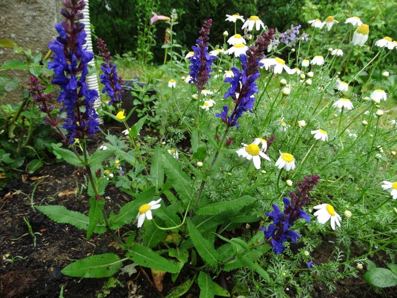 dzikie rumianki są w tym roku rewelacyjne, chyba samosiejki, bo tutaj był wykop pod instalację elektryczną i nie sadziłam rumianków w tym miejscu. Także szałwia i listek ciemiernika od Poli, :buziak w tle Louise Odier z trzema kwiatkami.
