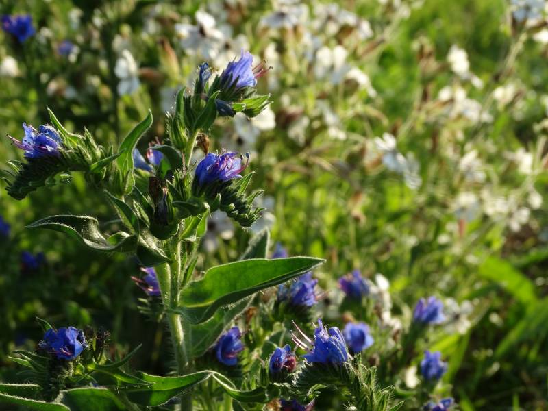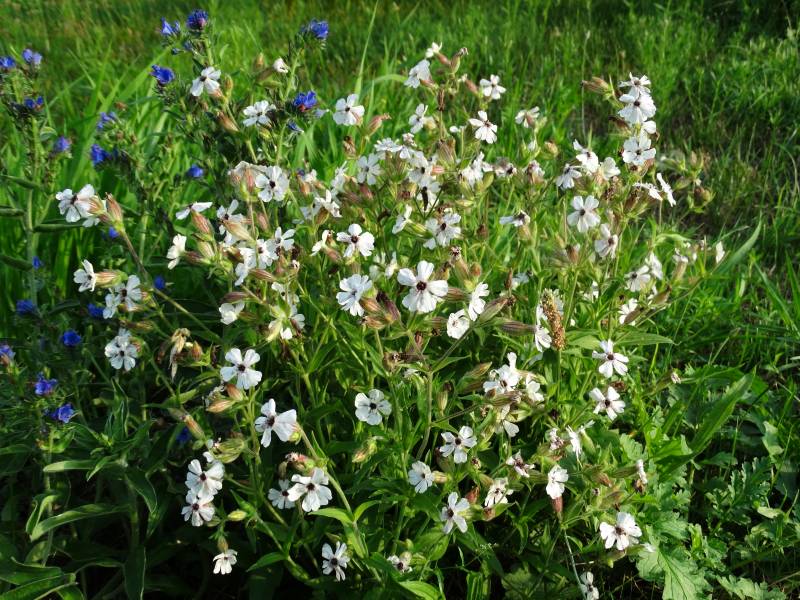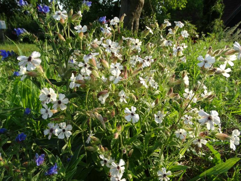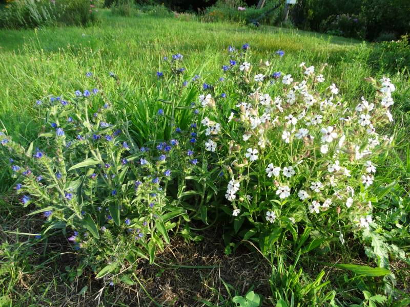 Samosiejki. Żmijowiec zwyczajny (Echium vulgare) i bniec biały (Melandrium album). Ten drugi wybitnie nadaje się do ogrodu, w porównaniu z bniecem lepkim, czy dwudzielnym, tworzy ładne kępki i nie pokłada się. Tamte usuwam, są mało ozdobne.