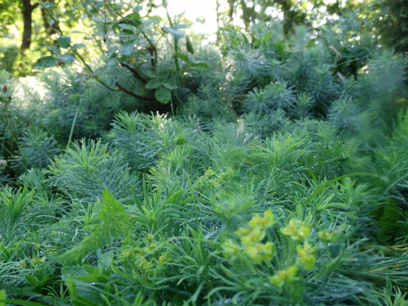wilczomlecz sosnka w porannej rosie, kolejna dzika roślina na nieużytku