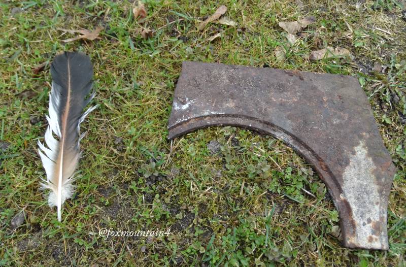 Znalezione w liściach z okazji wiosennych porządków, (liści przybywa, opanowanie sytuacji przypomina gaszenie manufaktury.) - piękne pióra, zapewne czerwonego kura, na zdjęciu tylko jedno i fragment płyty z paleniska kuchni drzewnej, czy węglowej, czyli coś dla złomiarza.