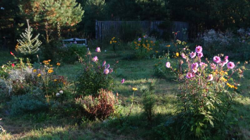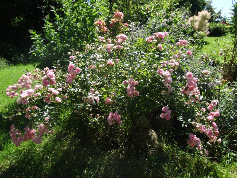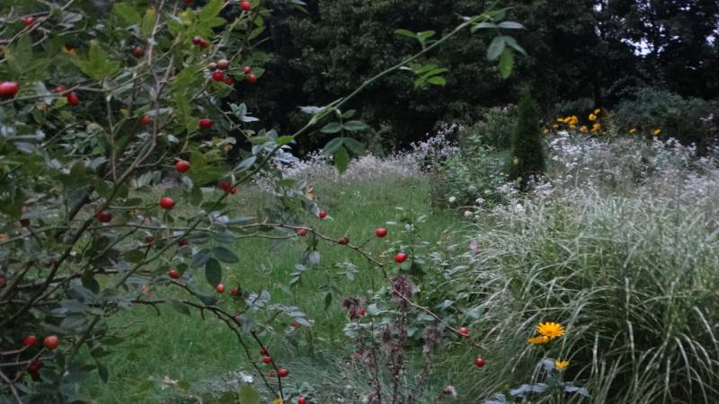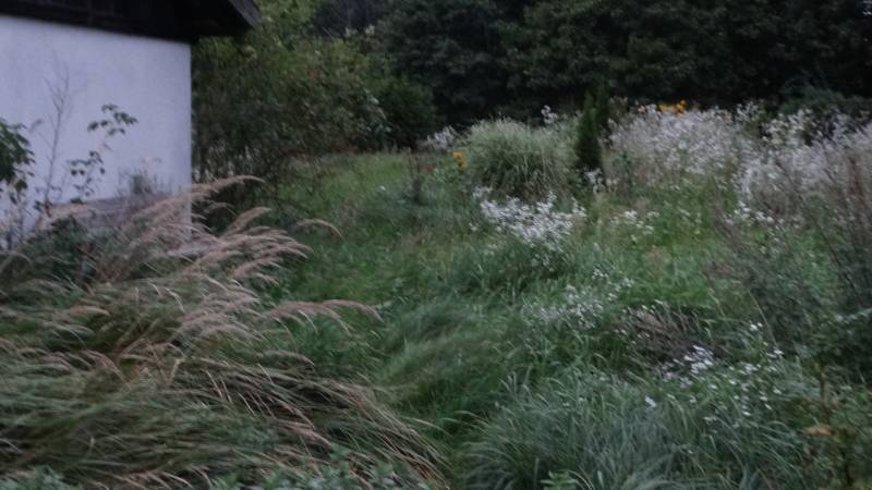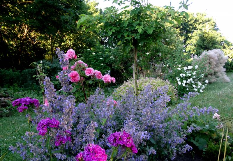 Tegoroczna łąka w miejscu wcześniej planowanej różanki. Róże tu nie czują się za dobrze, ale i tak robi się parkowo. W wolne miejsca dosadzam nadmiarowe byliny i jest klimat.