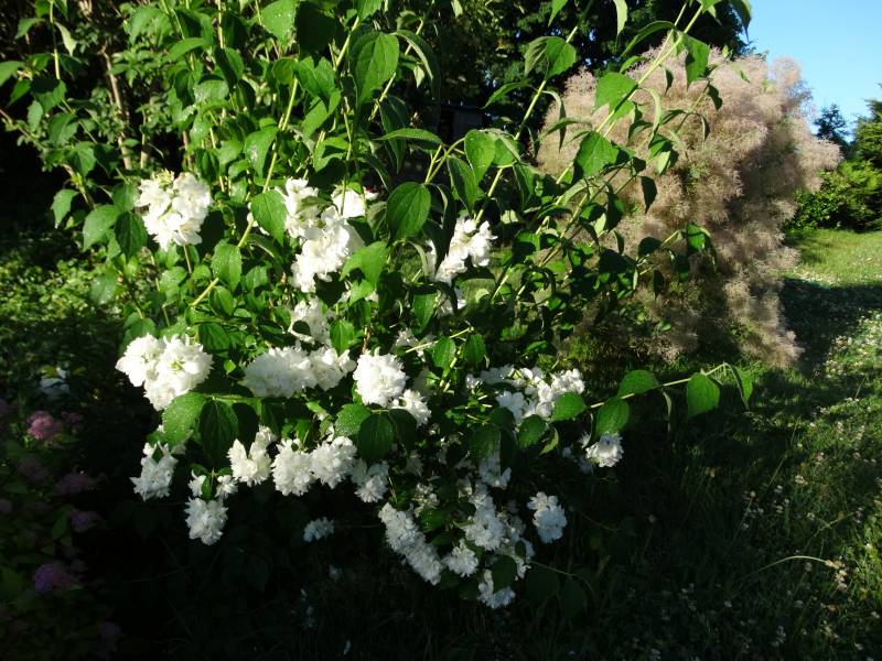 Rano pokazałam przykłady na dobre ciecie wiosenne i letnie, a teraz przykład braku ciecia i jego efekt. Ten miniaturowy jaśminowiec powinien mieć przycięte odrosty w zeszłym roku latem zaraz po kwitnieniu. Mam na myśli te gałęzie, które nie zakwitły. Uzyskałabym pięknie ukształtowany krzew, trochę większy niż strefa kwitnienia tego na zdjęciu, powiększony o późnoletnie i jesienne przyrosty i obsypany kwiatami. Ciąg dalszy w przyszłym roku, już wiem, jak go prowadzić.