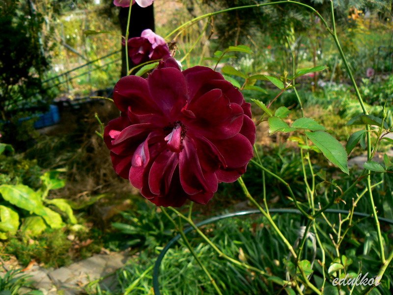 z prawej strony widać kawałek róży Poppius, która stworzyła istny gąszcz bardzo kolczastych pędów