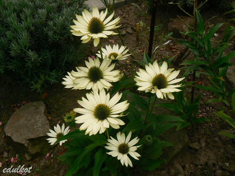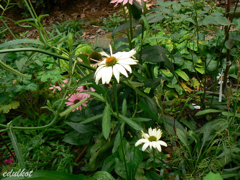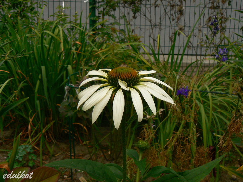 Kupiłam sobie nasionka białej jeżówki, wysiałam, słabo wzeszły ale kilka sporych kępek dosadziłam na przypłotkowej żeby dodać do towarzystwa samotniej Virgin.