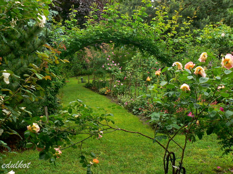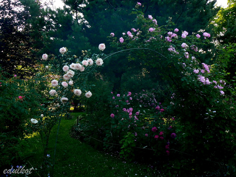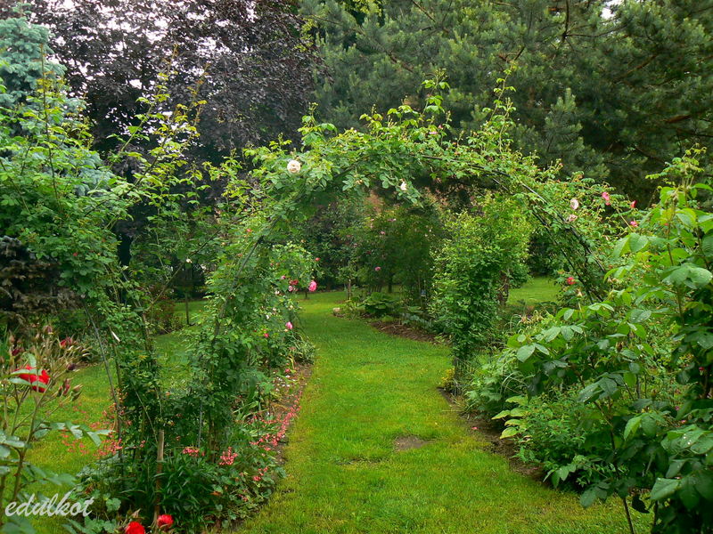 Majka jaka róża rośnie na tej dużej półokrągłej pergoli.