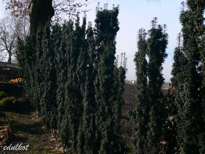 Te cisy to taka mieszanka, część wysokich i chudych to są samodzielnie wyhodowane z patyczków jakieś 18 lat temu. Trochę mi zabrakło i kupiłam trzy sadzonki w szkółce, miały być takie same a okazało się że każdy jest inny. Drażniły mnie te chudzielce więc dokupiłam w 2012 u Konieczki 10 sadzonek cisa pośredniego ‘Hicksii’ i dosadziłam pomiędzy te wąskie. Staram się przycinać żeby trochę się zagęściły, ale różnie to bywa.
