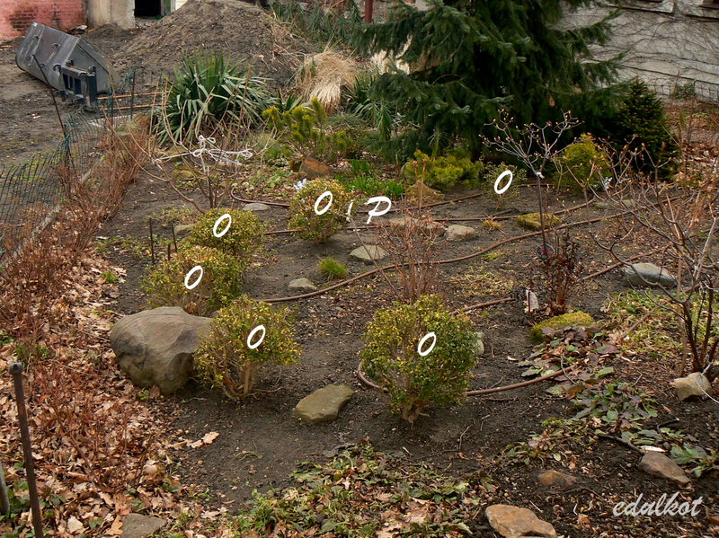 Wracając do przedogródka i tych nieszczęsnych bukszpanów, zrobiłam dzisiaj nowe zdjęcia, z drugiej strony. Widać lepiej że tu jest sporo miejsca, 0 zaznaczone bukszpany, P zaznaczone miejsce na pontyjkę.