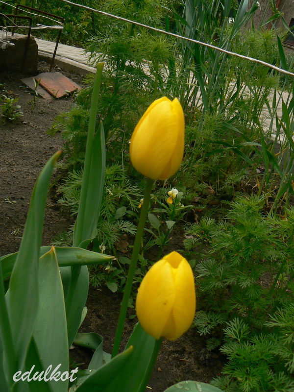 A w ogrodzie kapie, jeszcze rozkwitły tulipany żółte.