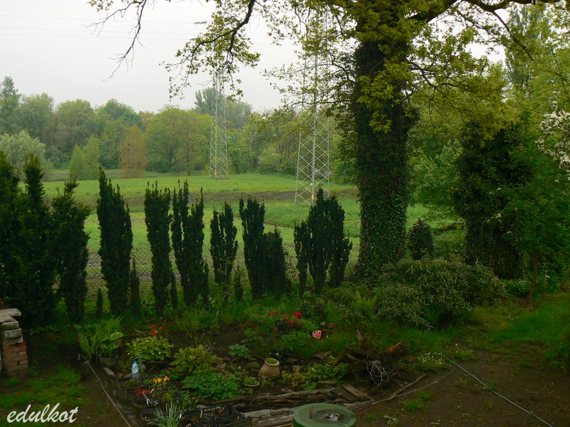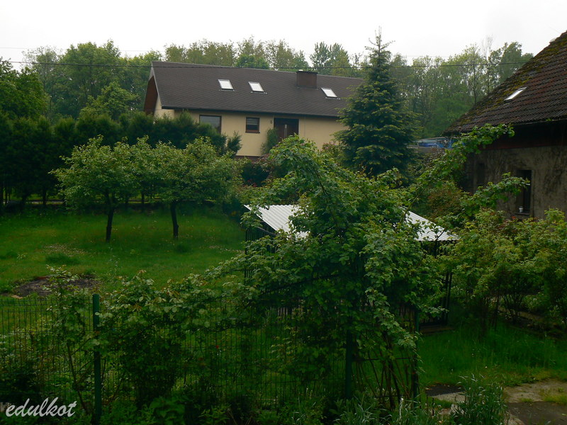 bardziej w prawo widać dalszy kawałek płotka, miejsce ogniskowe, 2 wiśnie, a w dali domek córki