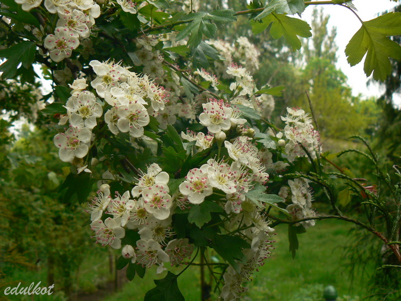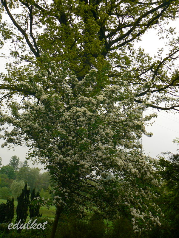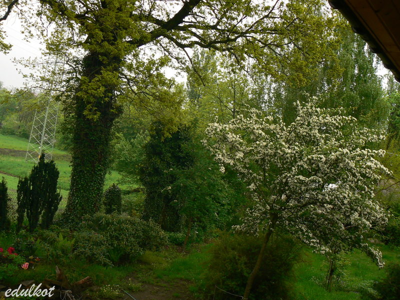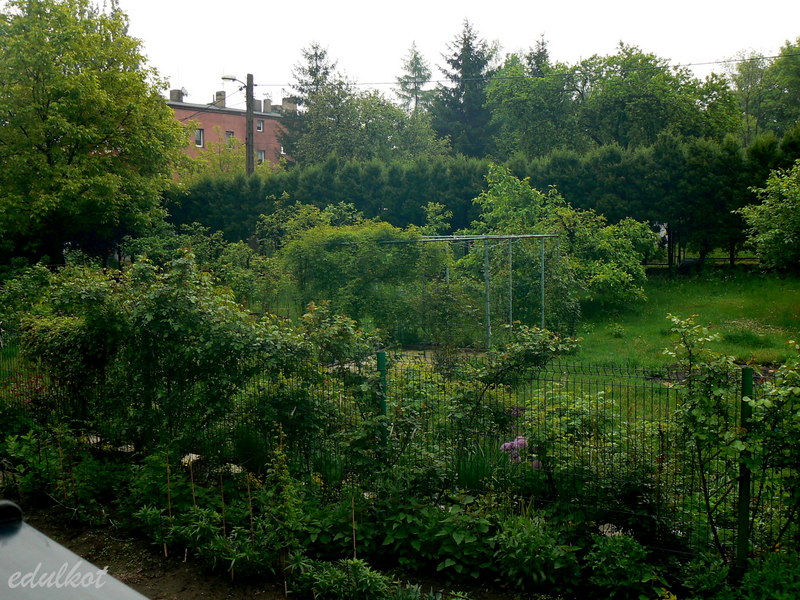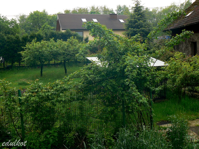 wychylając się i patrząc za wschód widzimy sosnę, basenową, łuki z różami i wielgaśny orzech włoski
