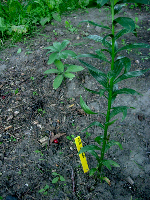 lilii lankongense. Cebulka est jeszcze mała i nie wiem czy ją zostawić, gdzie jest, czy przesadzić w lepsze miejsce. Chyba ją jednak zostawię, bo inaczej nigdy nie będę pewna jakie środowisko jej pasuje.