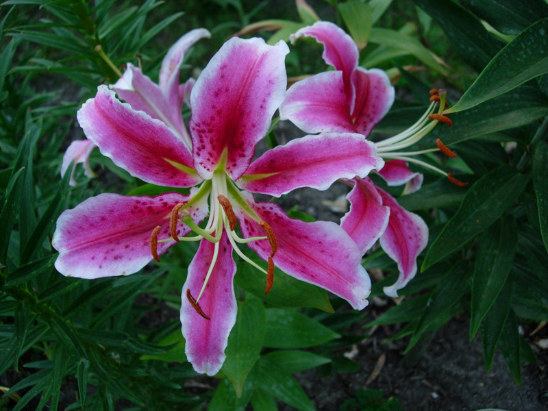 obok niej rosną: lilia kanadyjska i mieszaniec z lilią lamparcią - lilia Fusion, które tego samego dnia wyglądały tak