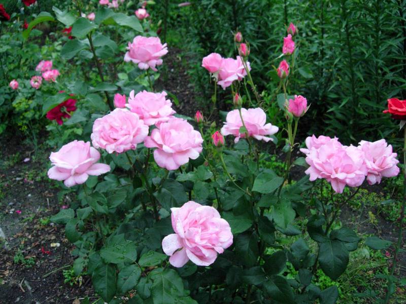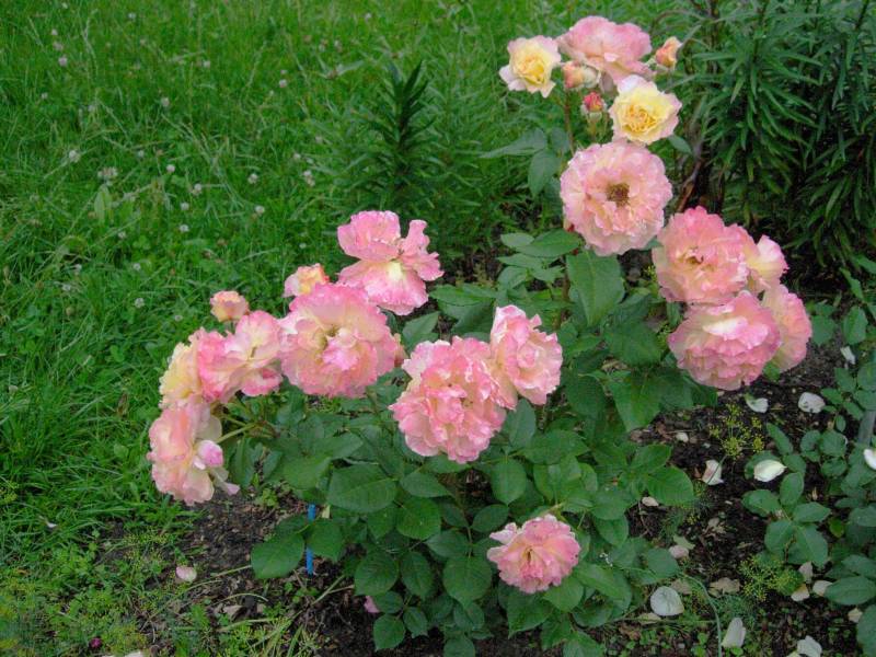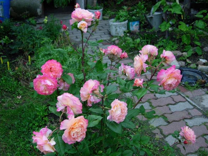 róża. Zawsze ma tak wiele, ak wielkich kwiatów, że krzaka prawie spod nich nie widać. Aquarell ściga się z nią jak może. U mnie dopiero rozkwita Tourbillon i My Girl. Inne róże zaczynają już mieć świeże odrosty, więc nawożenie zdecydowanie im się należy.