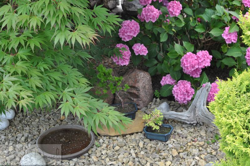 W kąciku japońskim za sprawą kwitnącej hortensji ogrodowej pojawił się kolor