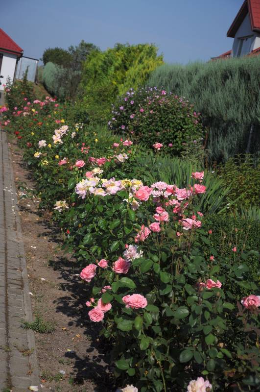 Tu, wzdłuż podjazdu kwitły wiosną tulipany, teraz królują róże