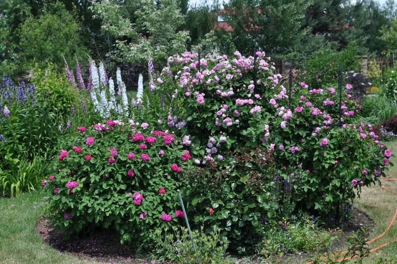 , głównie krzaczki lub same kwiatki, czasem w towarzystwie bylin. Prawda jest taka, że jak mam jakies zastrzeżenie do jakiegoś połączenia, to omijam aparatem, ewentualnie pokazuję tylko szczegóły. Ta tendencja świadczy o tym, ze jednak kompozycja jest dla mnie najważniejsza i jeśli są w niej braki, nieścisłości, czy niekonsekwencja, to jej nie pokazuję. Do tego nie wszystkie kompozycje wyglądają tak, jak w moich wyobrażeniach, a często przypadkowe zestawienia są tak trafione, jak sama nigdy bym na to nie wpadła. Dlatego znalazłam jeszcze trzy obrazki (tylko trzy), ale zawsze mogę zasypać Was zdjęciami pojedynczych róż