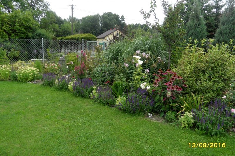 Zbyt wiele to ja nie wymyśliłam, ale skoro cześć trawnika ma być likwidowana, to trwały dyskusje, czy rabatę spod klona przenieść a tam zrobić trawnik, czy zostawić ten fragment tak jak jest. Mądra Marysia powiedziała, że jak rabatę zlikwiduję to za rok, 2 założę od nowa polewkamax . Argument nie do zbicia, więc zamiast likwidować rabatę uszczupliłam trawnik przy niej polewkamax . No bo właściwie, to nie wiadomo było czy to trawnik czy ścieżka. Teraz już chyba nikt nie będzie miał wątpliwości polewkamax :Z jednej strony, to już nawet zagospodarowałam pozyskaną cześć dosadzając obwódkę z bergenii i szałwii: