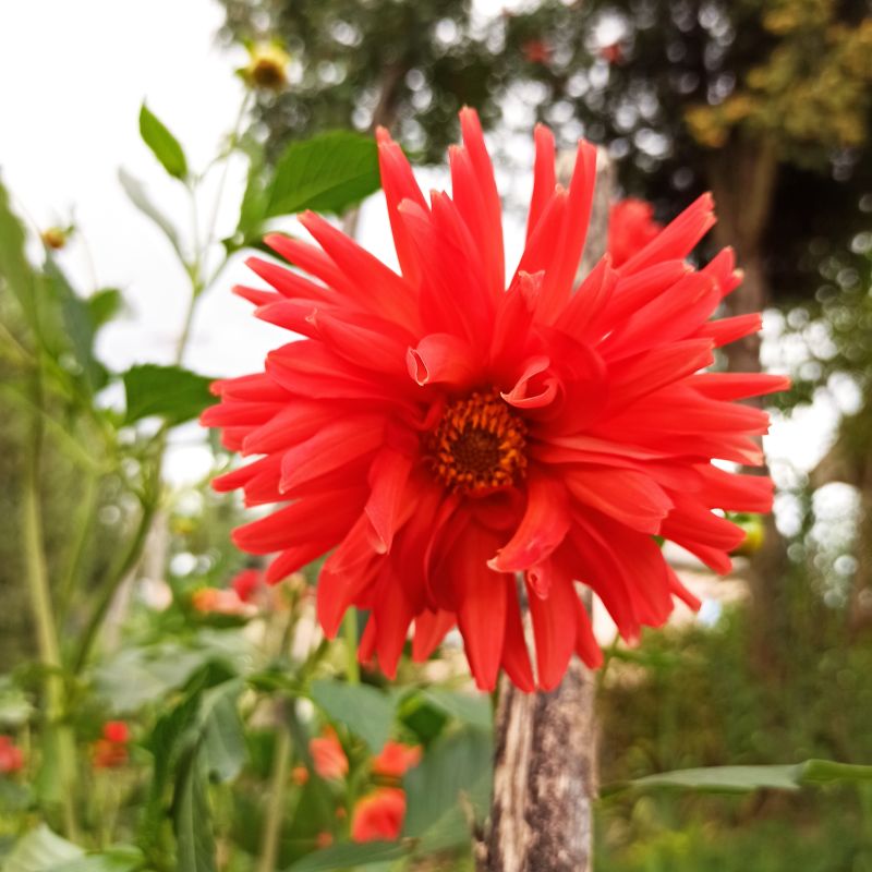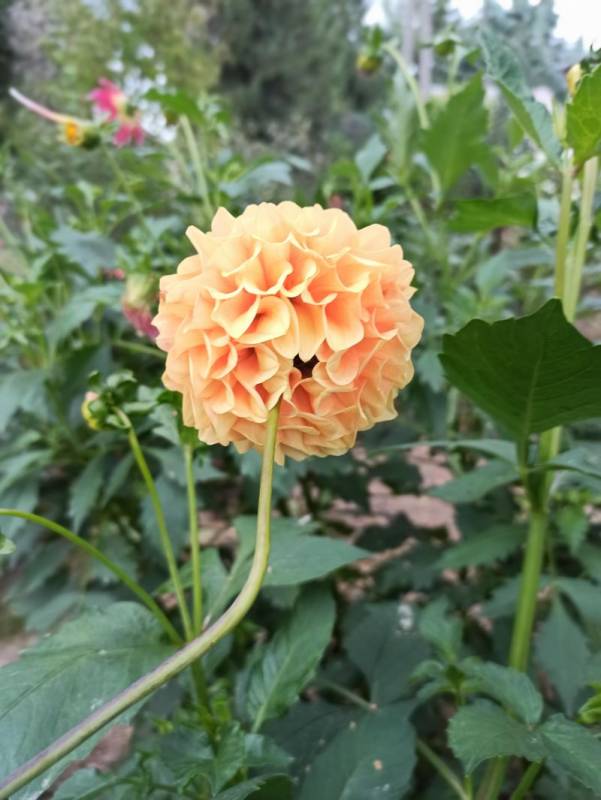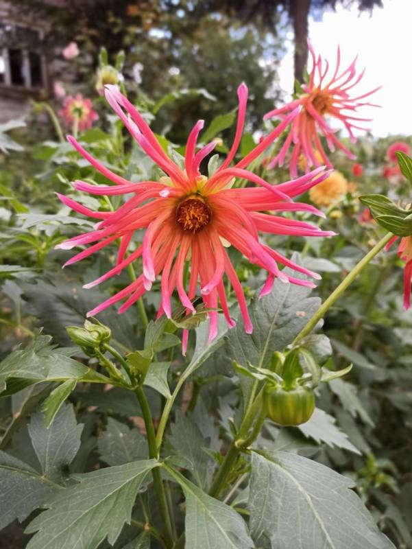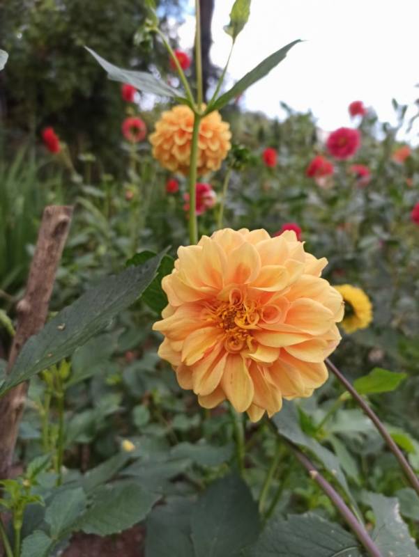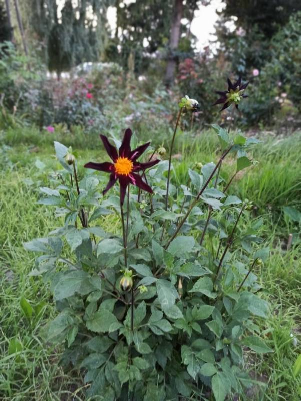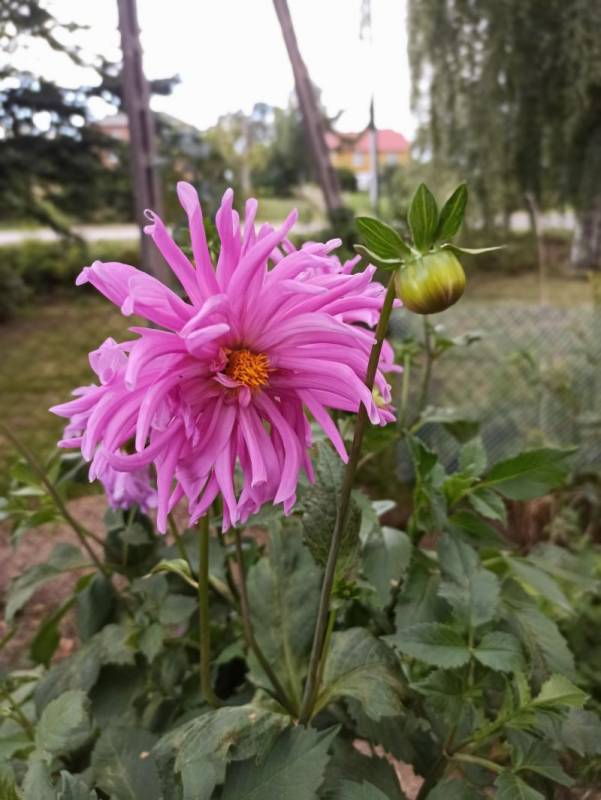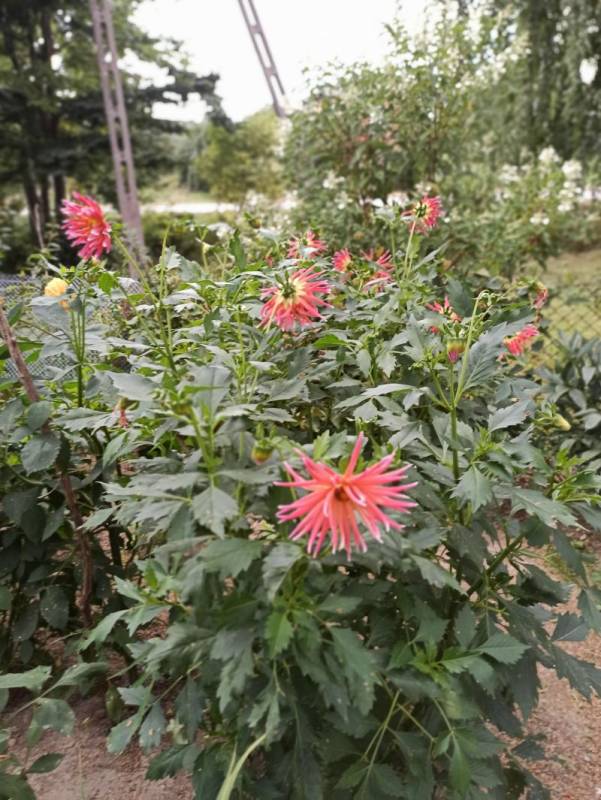 To są dalie z siewu mojej mamy, która lubi siać ale nie lubi bawić się w przechowywanie ich, więc ona sobie sieje a na jesieni ja je ratuję przed pryzmą kompostową i wywożę do siebie. Pielęgnuję sobie taki kawałek tradycyjnego wiejskiego ogródka, jaki miała moja babcia, który się wygradzało, żeby kury i inne ptactwo domowe nie siało tam szkody i uważam, że właśnie takie "niewyfikane" tam pasują. A poza tym już kwitną, w przeciwieństwie do posadzonych odmianowych, które chyba zapatrzyły się na róże i póki co rosną tylko w liście