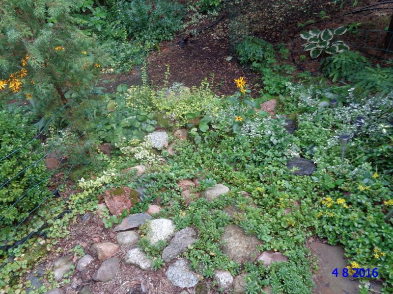 Pikutku, to miejsce pod cyprysikiem jeszcze będzie zmieniane. Posadziłam tam paprocie, które stawiają opór mojej koncepcji i rosną milimetr na sezon, pewnie taka ich uroda, ale pójdą sobie gdzie indziej, a tu pojawią się hosty i paproty o lepszym charakterze.