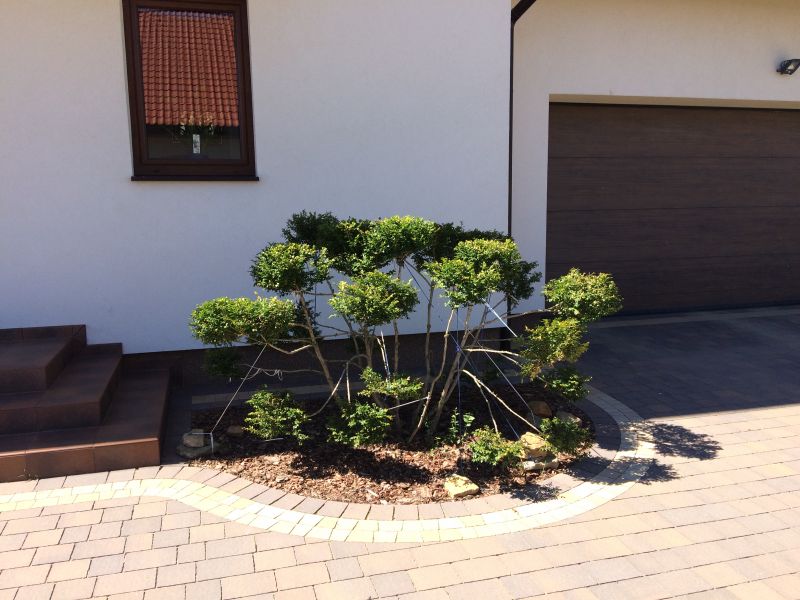 Na tej rabacie rósł cis, małe berberysy, okazałe hakonechloe. Po pojawieniu się bukszpana wszystko wyjechało- komisyjnie z P uznaliśmy, że tak okazała roślina nie potrzebuje dodatków, a wręcz straciłaby na urodzie. Jedynie lampkę muszę tu postawić- w końcu chcemy się zabrać za oświetlenie w ogrodzie.
