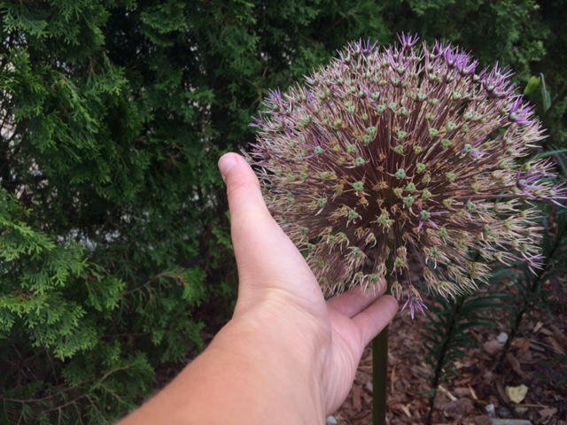 rabata na rogu działki. DOśc spokojna- jedynie szałwie kwitną, a przekwitają 3 czosnki. Bardzo bym chciała jesienią kupić i dosadzić tu jeszcze kilka sztuk, rozsianych po tej rabacie- nie sądziłam, że są tak długo ozdobą!