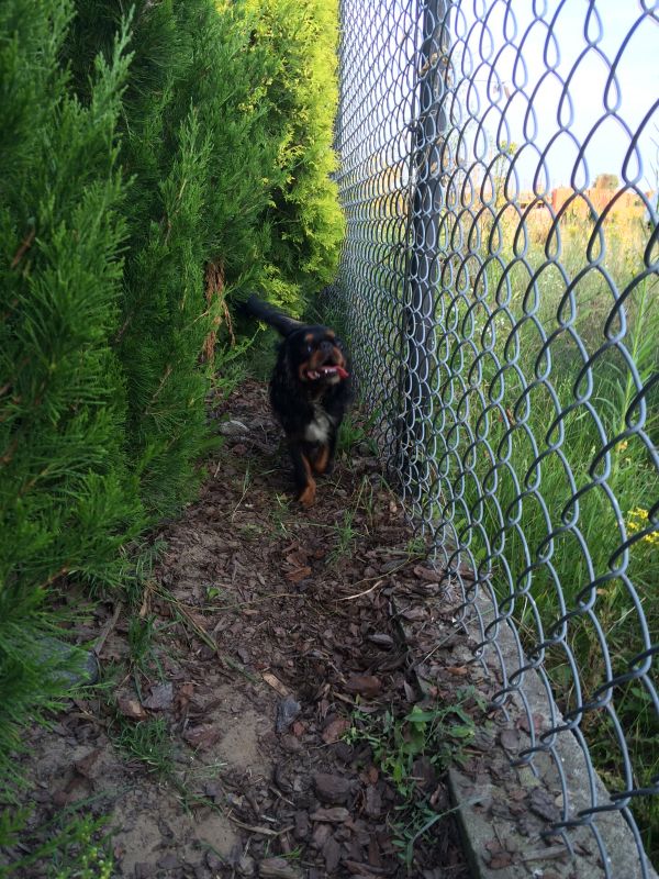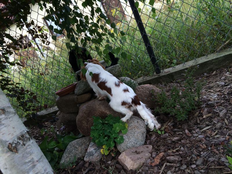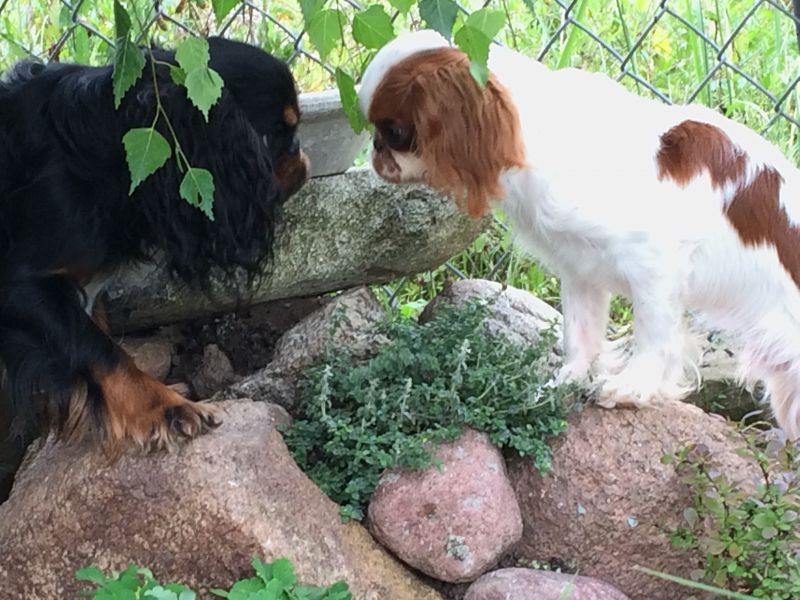 Na ogródku chodzą swobodnie. Maluszek tropi Cygusia, a Łabądek nie odpędza go. W domu musztruje Marviga, jak chce podejść. W którymś momencie usiadłam na krześle, Marviś merdając ogonkiem chciał podejść, a Cyguś, tez merdając, krążył dookoła mnie, jak rekin
