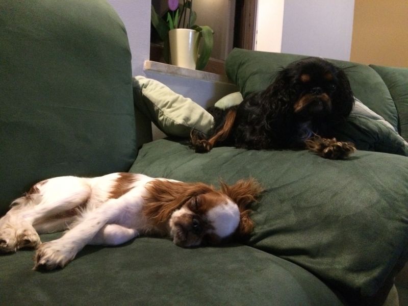 Na razie to pierwsze wspólne godziny. Ja jestem trochę zestresowana, obserwuję Cygusia czujnie. Psiaki często ziewają, uspokajając się. Maluszek czai się, Cygus krąży merdając trochę ogonem..mam nadzieję, że z czasem (szybkim..) wypracują taką współpracę, że jak Cyguś będzie siedzieć na kanapie, to Marvigowi będzie wolno wskoczyć.