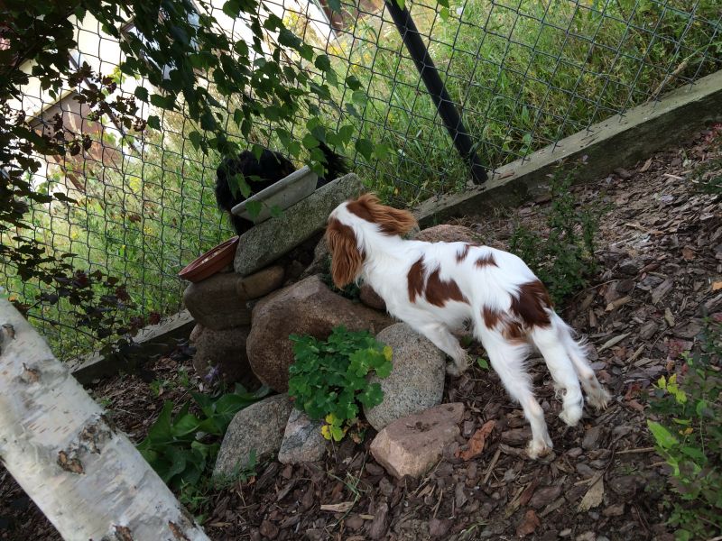 Wspólne wychodzenie na ogródek jest ok- bez awantury przy drzwiach. Po ogródku też dobrze- Cyguś ma sporo pracy, więc nie ma czasu się zajmować intruzem.