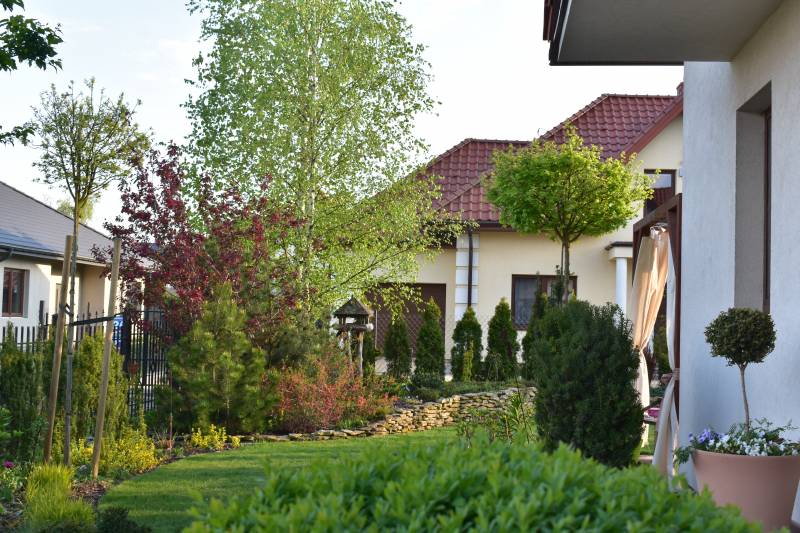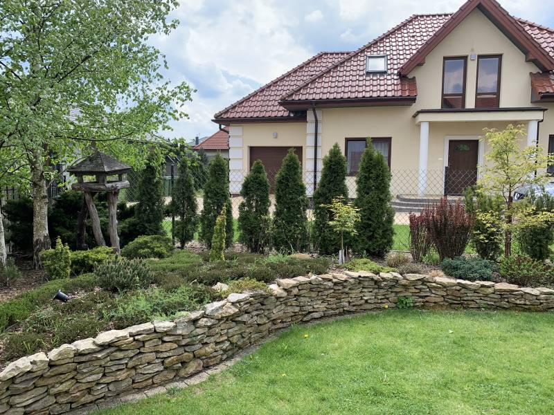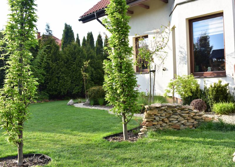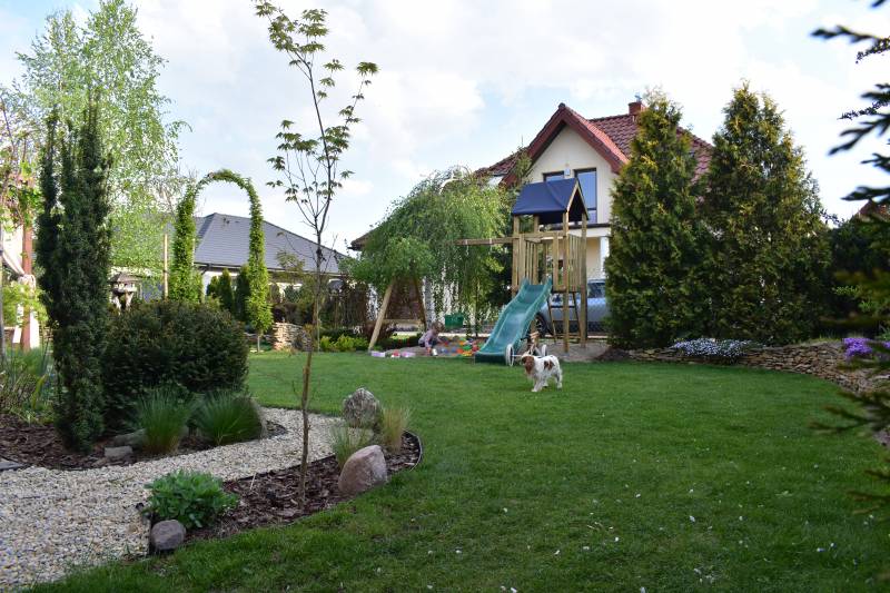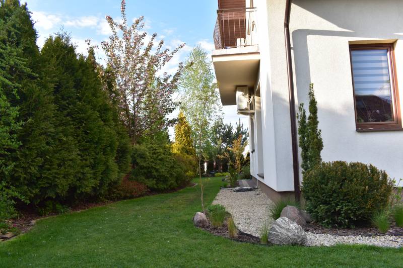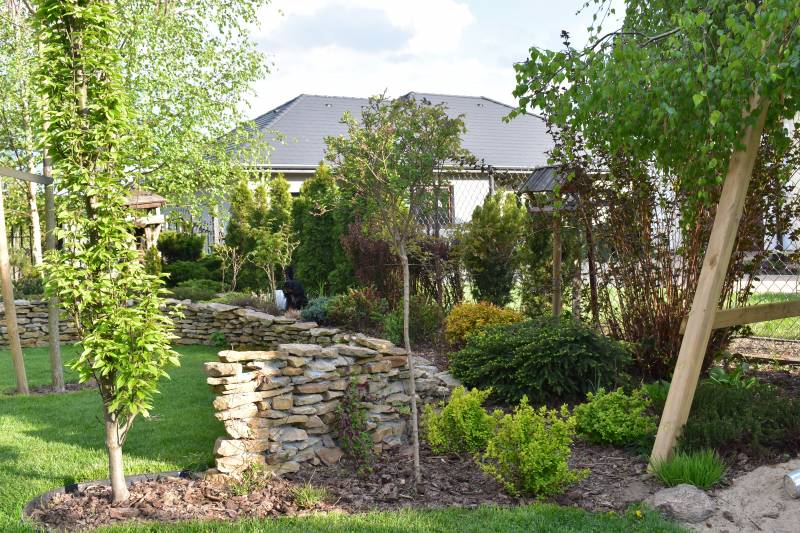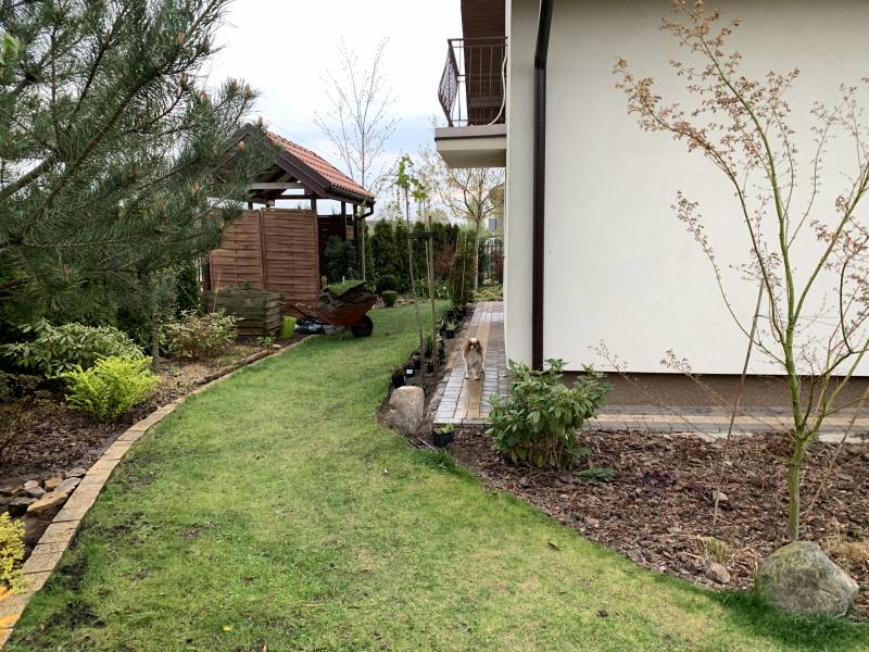 ( dzięki pandemii w tym roku pewno nie- miał robić znajomy stolarz, który przyjeżdża do sasiadow, ale z okazji korony pewno ne przyjedzie)..tak wiec jak powstaną, to sobie coś wymysle, jak to ze schodami połączyć.. na razie jest od czapy..ale zakręt przy żwirku zrobił się bardziej urokliwy, niż sam żwir do trawy, wiec jakis sens w tym jest.