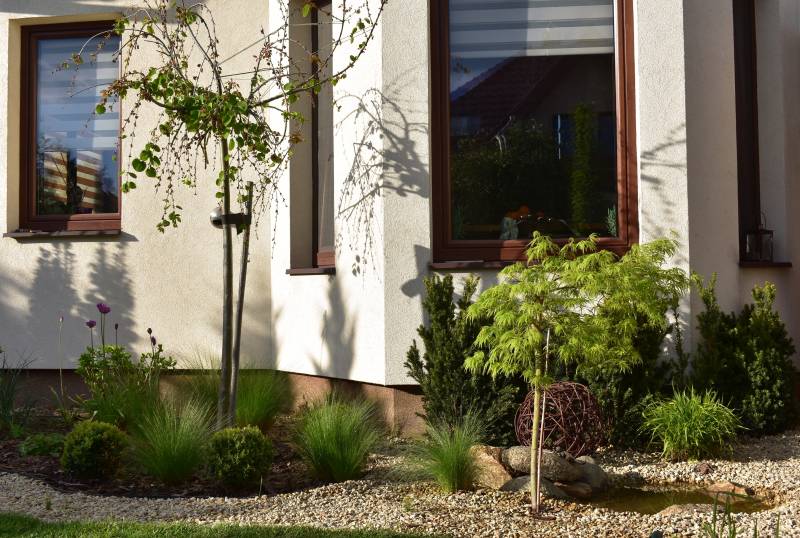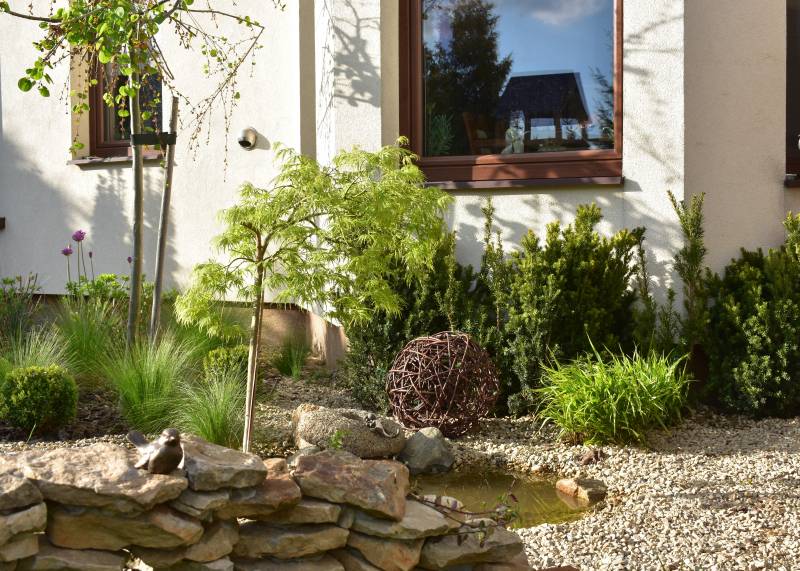 Konieczne było dla ukojenia mężowskich nerwów zasłonięcie ściany..tak wiec przesadzone dwie trawy, przeniesiony dissectum i ekran z cisa jako tło.