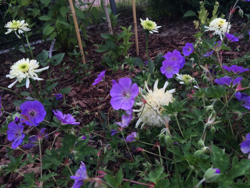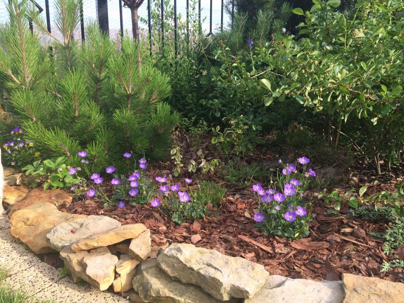 dodatkowa plama koloru w tym miejscu, to przecudowne bodziszki ROzanne- kwitną cudownie i nieprzerwanie. Dla podkreślenia ich koloru dostały do towarzystwa jeżówki Mozzarella- kupione 2 tyg temu, więc jeszcze mocno nieopierzone..