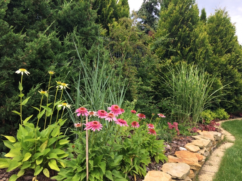 Jeżówki lubię bardzo i na razie jestem zadowolona z ich przyrastania. Podoba mi się baaardzo dużo odmian, ale nie mogę u siebie zbytnio poszaleć- nie chcę wprowadzać oczopląsu kolorystycznego. Trzymam sie więc różu i bieli- i tak uzupełnione jest to wszystko sporą plamą fioletowych bodziszków ROzanne i różnymi trawami. Wystarczy chyba tej różnorodności, jak na tak małą powierzchnię.