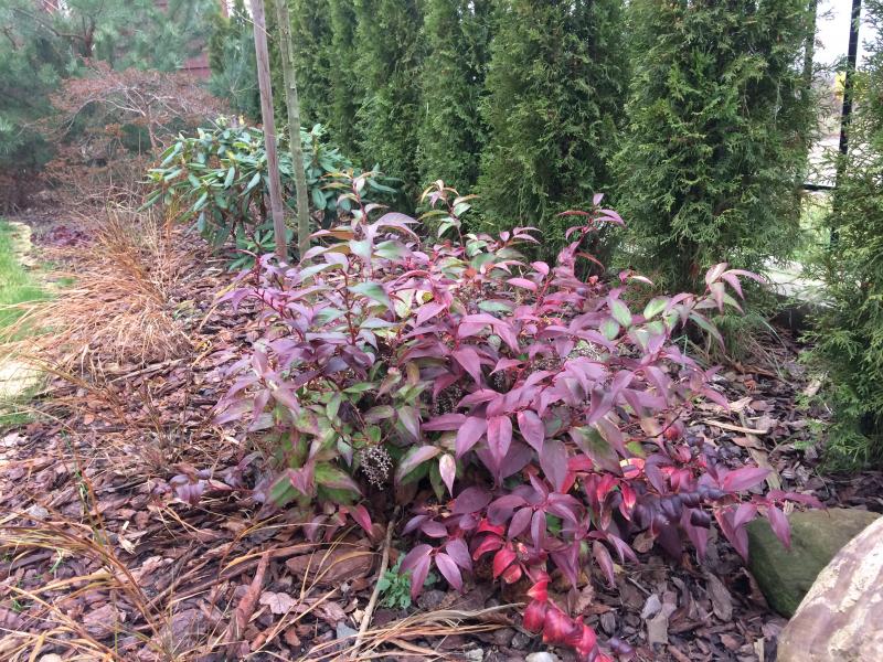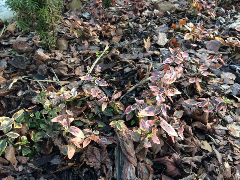 trzmielina przebarwiona, oby ładnie zimowała. Jeszcze jakieś 2 lata i będzie tu liściasty dywan