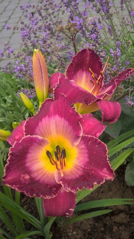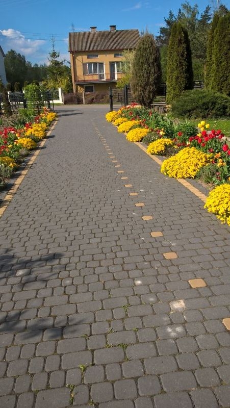 W pierwszym roku miałam tam trochę tulipanów wiosną a później aksamitki.Kiedy mój mąż wpadł na pomysł zerwania tego betonu i położenia kostki,rabaty same mi się powiększyły ,a ponieważ są długie i dość szerokie ,a ja mam żyłkę kolekcjonera to ciągle je obsadzam i skończyć nie mogę ,bo albo czasu brak ,albo sił ,albo kasy :nie_wiem