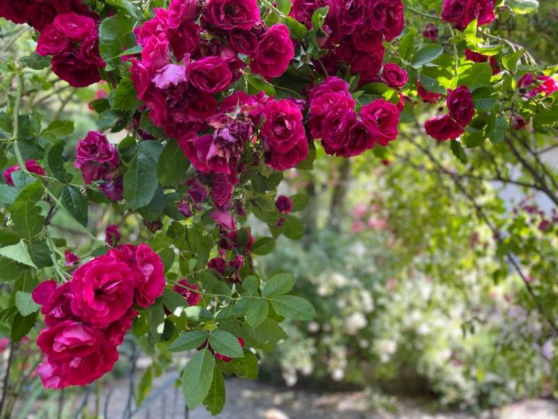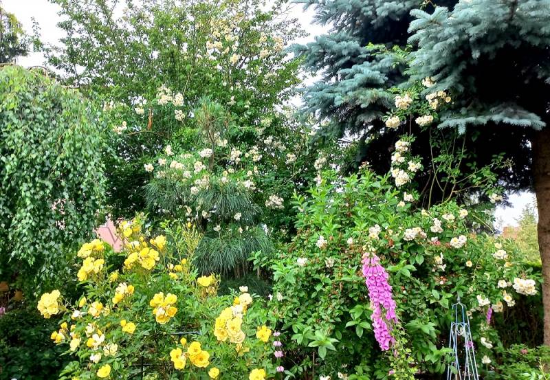 i za bliska róża wspina sie juz na dwa drzewa szkoda tylko ,że kwitnie tylko raz .