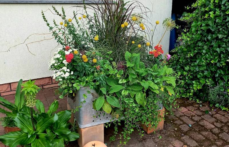 skrzynia też nabrała wigoru a dosypanie ziemi z kompostu spowodowało ,że kwitną w niej kwiaty wysiane samoistnie jednoroczne