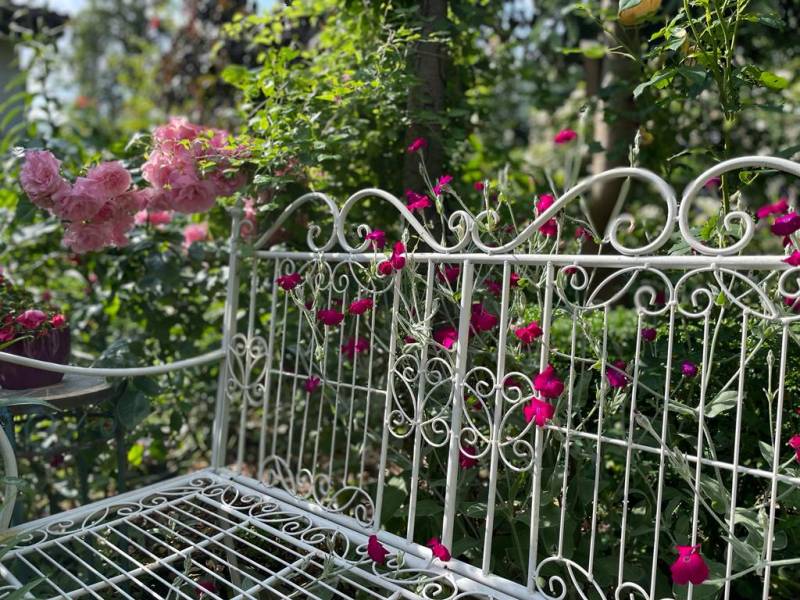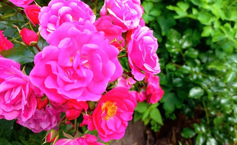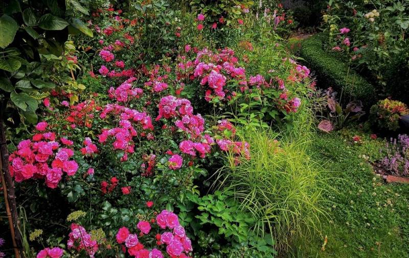 W ogrodzie kwitną róże, które rozwijają swoje kwiaty później