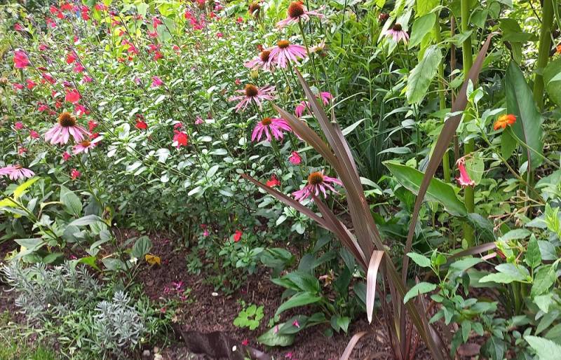 otoczony szałwią rośnie len nowozelandzki -przezimował w gruncie ale wiosną trudno dochodził do siebie.