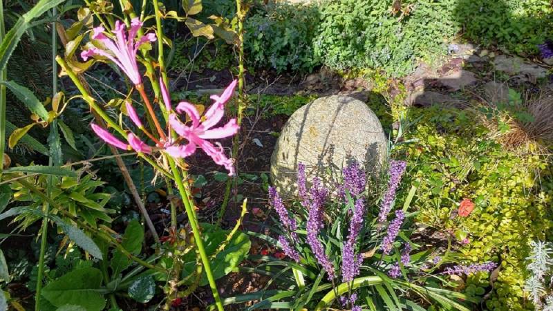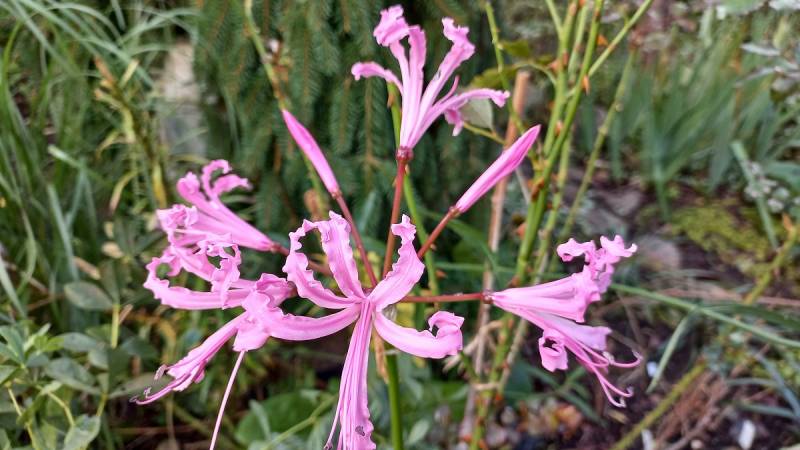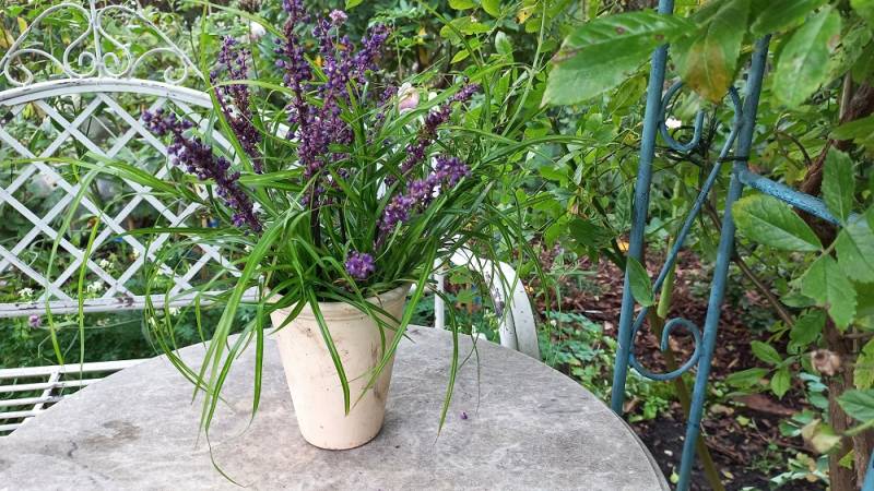 Liriope przed podziałem a najważniejsze ,że zakwitła cebulka Neriny zimująca w gruncie inne Neriny wypuściły tylko liście .