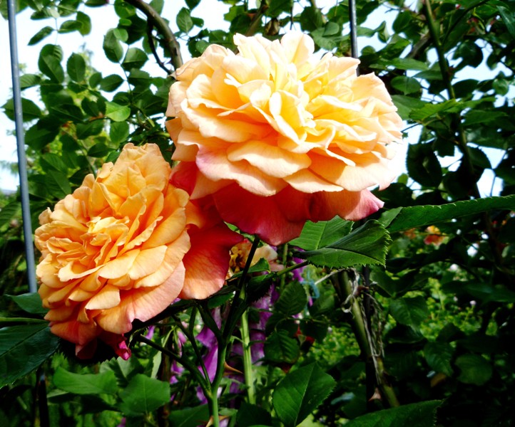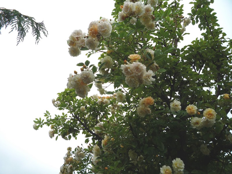 Róża pnąca 'Ghislaine de Feligonde' już tak urosła ,że siedzi już na drzewie gruszy.